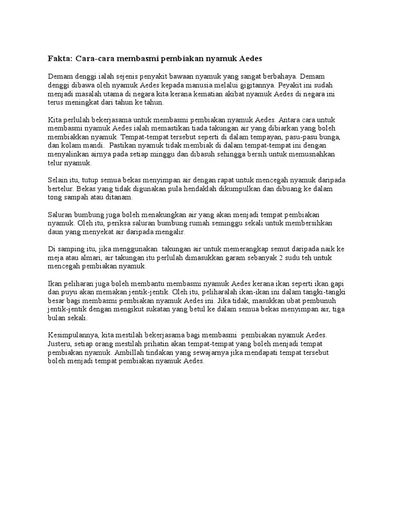 Karangan Ceramah Demam Denggi : Karangan Spm Langkah Pencegahan Penyakit Berjangkit. Orang yang sihat boleh menghidap penyakit ini melalui gigitan nyamuk aedes yang mengandungi virus denggi. Punca dan langkah mengatasi penyakit demam denggi. Demam denggi penyakit demam denggi telah mula dilaporkan di malaysia oleh skae pada tahun 1902 di pulau pinang apabila berlaku wabak denggi di situ. Penularan penyakit deman denggi telah meragut banyak nyawa di malaysia. Penyakit demam denggi berpunca daripada nyamuk aedes.